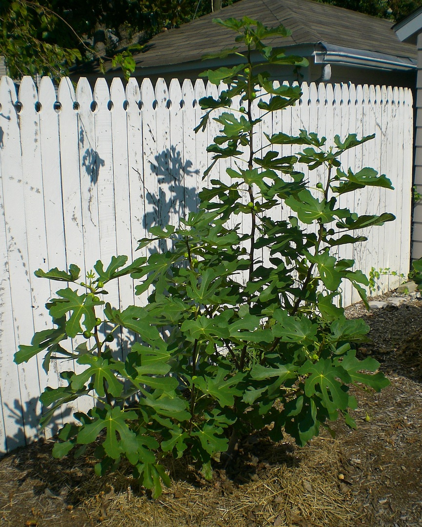 | Strawberry Verte fig tree. This tree grew about 5 feet this season is now over 7 feet tall. I will prune it back in late winter to keep it a manageable size for harvesting figs without a ladder. |